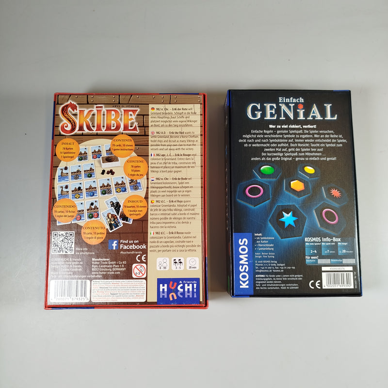 Dieses Set enthält zwei beliebte Gesellschaftsspiele: „Skibe“ von HUCH! – ein strategisches Kartenspiel mit Wikingerthema, in dem Spieler ihre Flotte aufbauen und Handelsrouten sichern müssen. „Einfach Genial“ von Kosmos – ein taktisches Legespiel von Reiner Knizia, bei dem durch das geschickte Platzieren von Hexagon-Plättchen Punkte gesammelt werden. Beide Spiele sind vollständig und in gutem Zustand. Hinweis: Die Verpackungen weisen leichte Gebrauchsspuren auf.