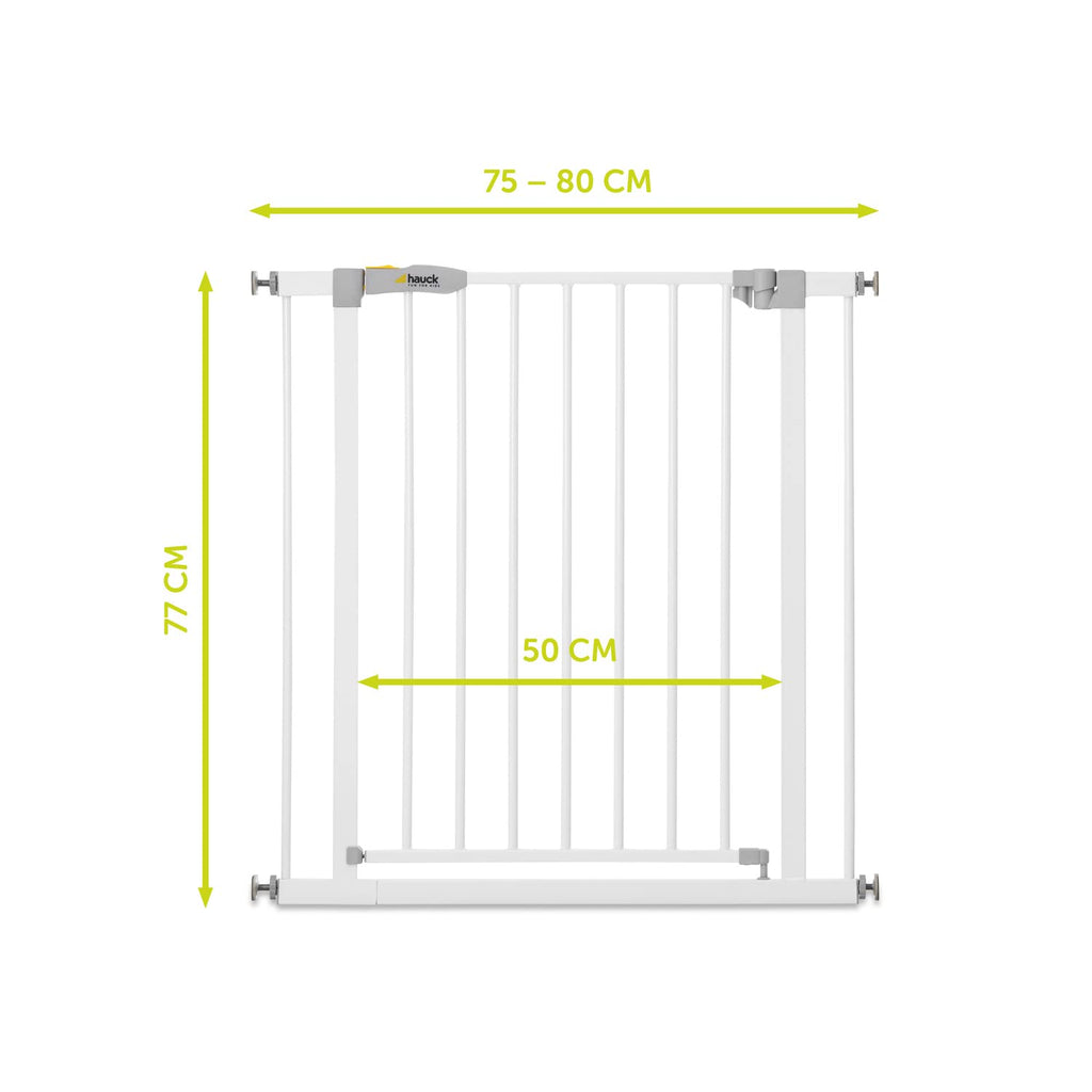 Produktbeschreibung Dieses Kinderschutzgitter ist ideal zur Absicherung von Türen bzw. Treppen mit einer Breite von 75 - 80 cm. Alternativ und für breitere Durchgänge empfehlen wir das Open N Stop KD inkl. 9 cm Verlängerung (84-89 cm) bzw. das Open N Stop KD inkl. 21 cm Verlängerung (96 - 101 cm).Das Metallgitter lässt sich mittels Stellschrauben sicher zwischen Türrahmen, Wänden oder Treppenaufgängen einspannen. Es muss nicht gebohrt werden. Zum Hindurchgehen können Erwachsene die Tür mit nur einer Hand in beide Richtungen öffnen. Dadurch ist die andere Hand für den kleinen Schatz oder Einkaufstaschen frei. Das Open N Stop KD hat einen manuellen Schließmechanismus mit einer Zweifach-Sicherung, wodurch ein unkontrolliertes Öffnen durch Kinder verhindert wird.Mit den separat erhältlichen Verlängerungen von 9 cm bzw. 21 cm kann das Absperrgitter flexibel bis zu 122 cm erweitert werden. Zusätzlich ist die Kombination mit Y-Spindeln an Treppengeländern mit runden oder ovalen Stäben möglich. Die Y-Spindeln werden bei Bedarf an einer Seite des Gitters und anstelle der Stellschrauben angebaut. Deshalb ergeben sich die gleichen Öffnungsmaße:75 - 80 cm = Kindergitter Open N Stop KD84 - 89 cm = Kindergitter + 9 cm Verlängerung (optional bzw. alternativ als Sparset erhältlich)
