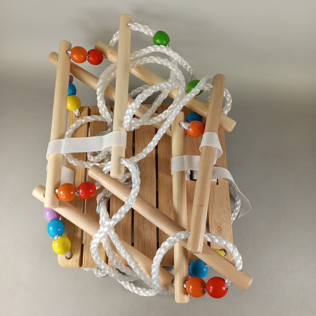 Diese Kleinkinderschaukel aus Holz ist ein Gartenspielzeug für Kinder und eignet sich durch ihre stabile Holzkonstruktion zum sicheren Schaukeln im Freien. Sie besteht aus einem Holzsitz mit Holzstäben, verknüpft durch weiße Seile mit farbigen Kugeln sowie weißen Stoffgurten. Altersempfehlung: 1–2 Jahre. Achtung: Nur unter Aufsicht von Erwachsenen verwenden.