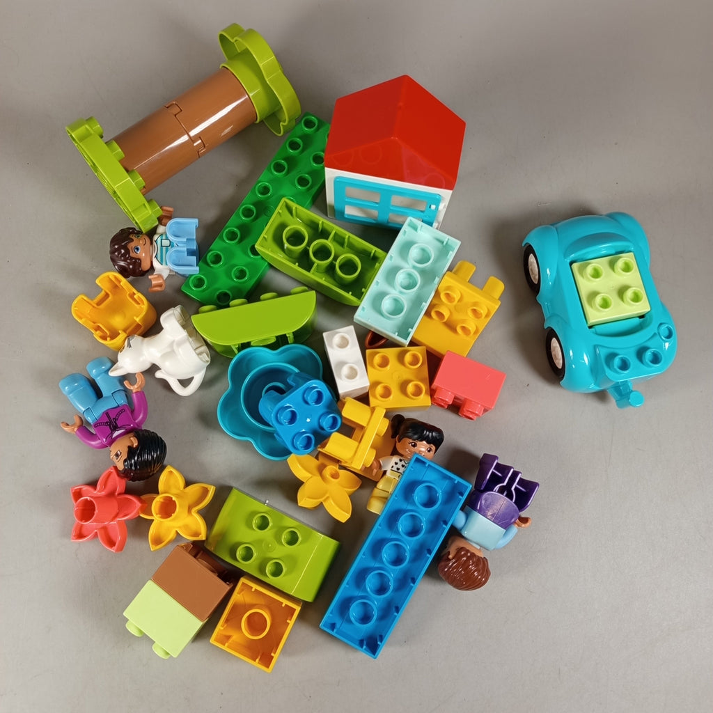 Hol dir das bunte LEGO Duplo Bausteine-Set 10913 und entdecke grenzenlosen Bauspaß! Enthalten sind eine blaue Auto-Basis, ein Haus mit rotem Dach, 5 Figuren (4 Menschen und 1 weiße Katze) sowie viele bunte Steine und Zubehör wie Bäume, Blumen, Zahlensteine und Brotstücke. Ein ideales Set für kreative Kleinkinder. Das Spielzeug ist gebraucht und in sehr gutem Zustand. Die Vollständigkeit konnte nicht überprüft werden. Hinweis: Enthält Kleinteile, nicht geeignet für Kinder unter 3 Jahren.