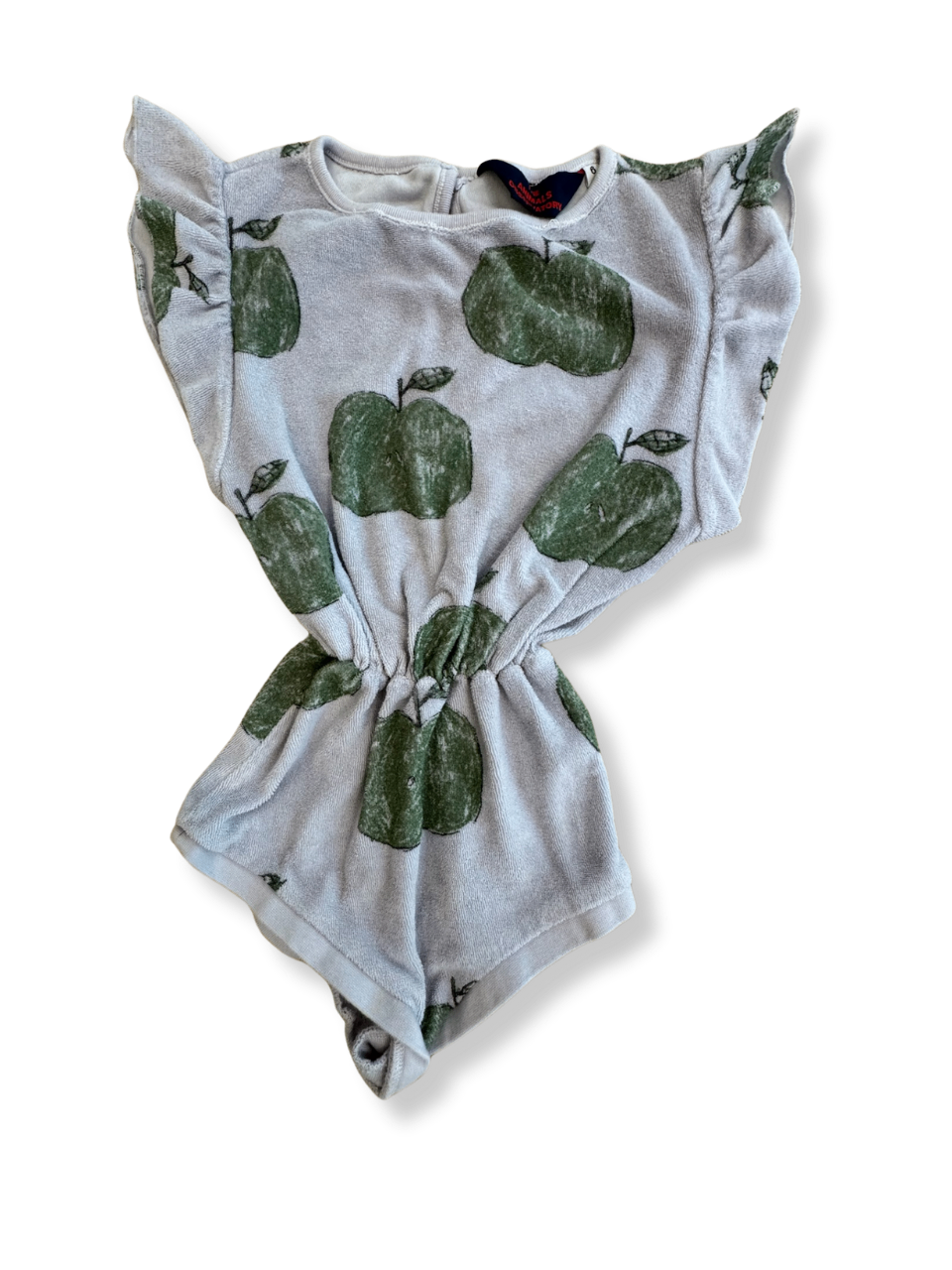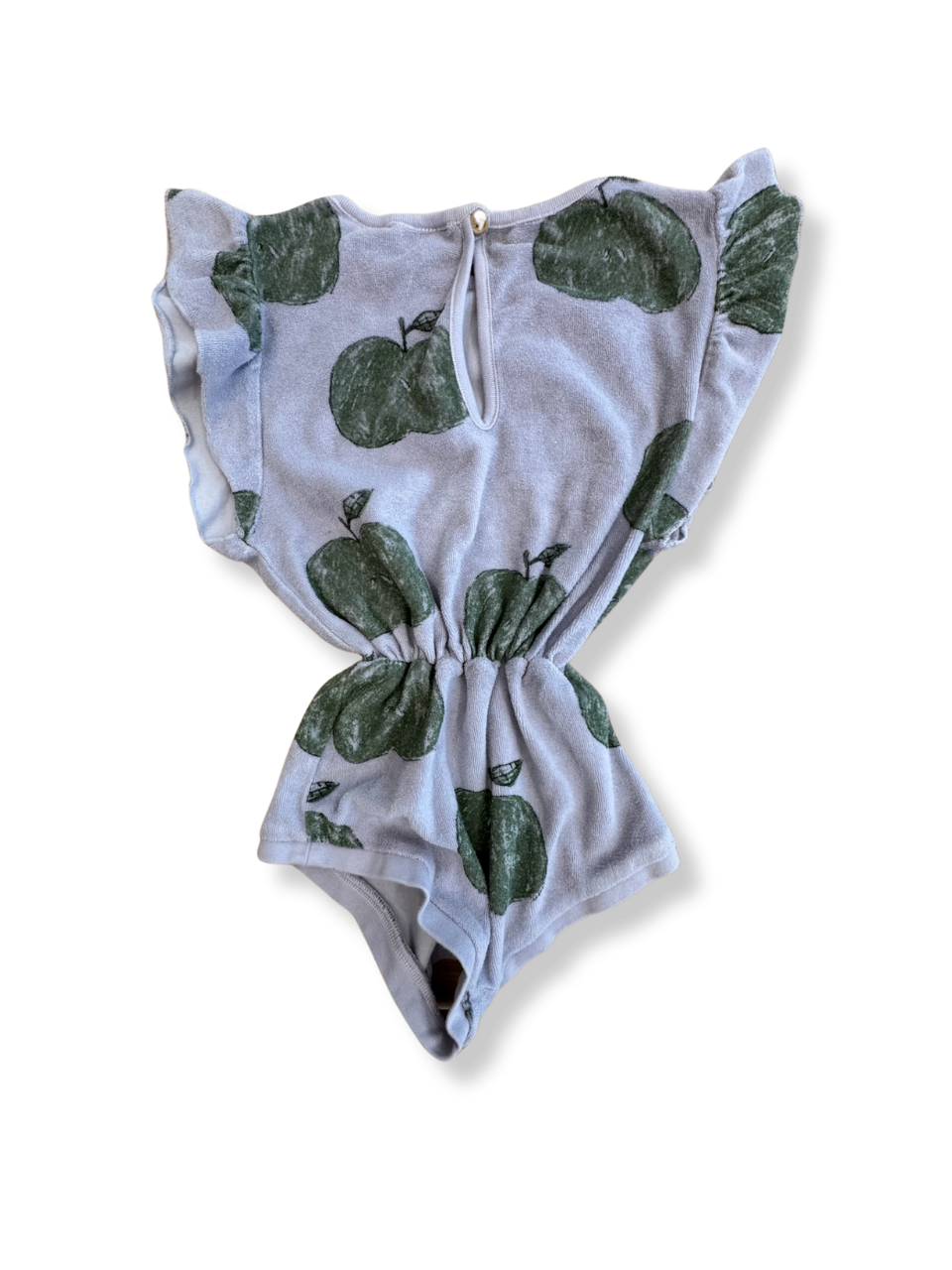 Dieses lässige Kleidungsstück aus Frottee präsentiert einen verspielten Apfel-Print in grüner Farbe auf mauve-farbenem Background. Es ist bequem geschnitten mit einem elastischen Taillenbund, ideal für entspannte Tage.
