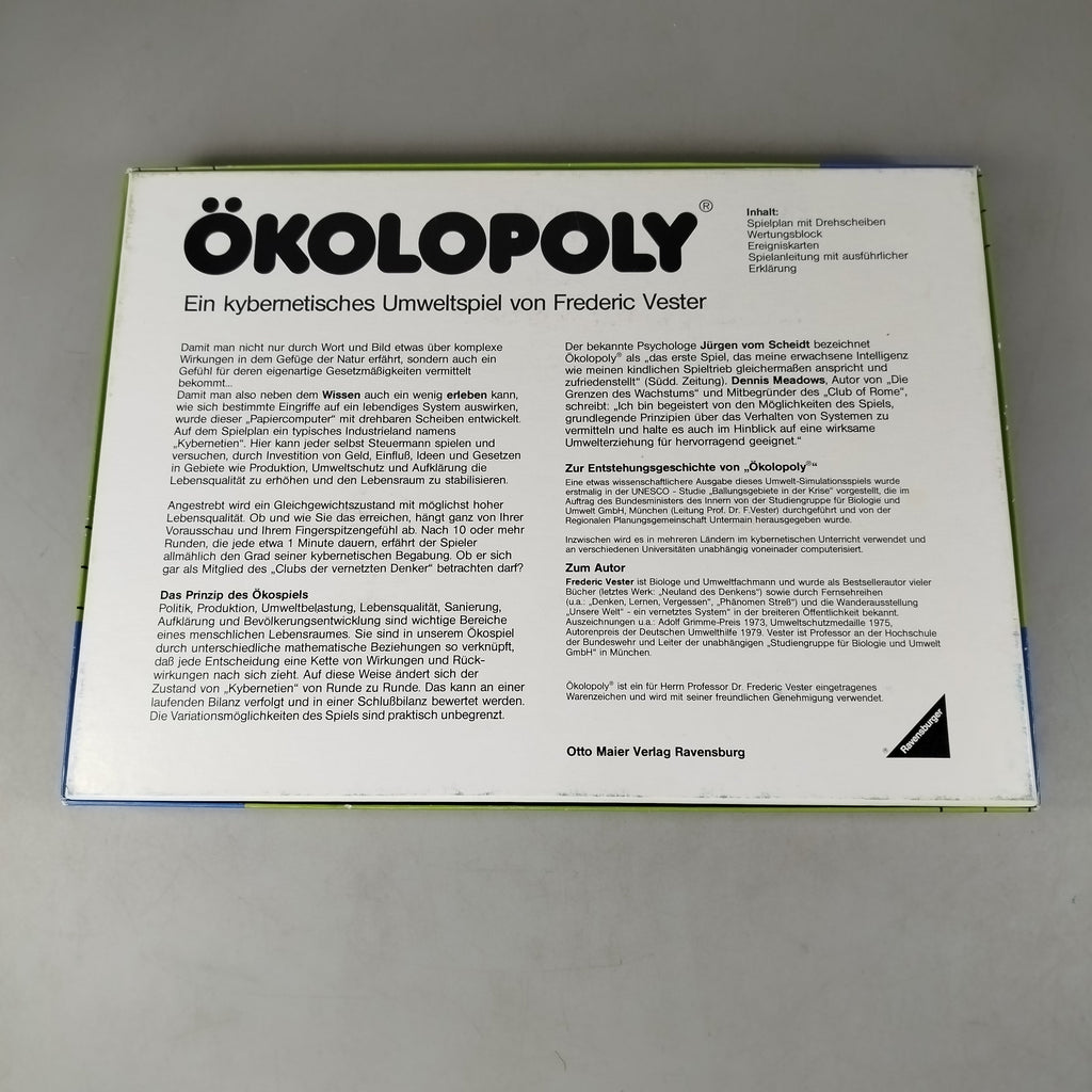 Hol dir das Ravensburger Brettspiel Ökolopoly – ein kybernetisches Umweltspiel von Frederic Vester – und tauche in strategische Entscheidungen rund um Politik, Wald und Aktionspunkte ein. Das Spielbrett mit integrierten Drehscheiben sowie Spielanleitung, Informationsheft und Wertungsblock sind enthalten. Gib diesem Gesellschaftsspiel ein neues Zuhause und verbinde Spielspaß mit Umweltbewusstsein. Geeignet ab 10 Jahren. Hinweis: Enthält Kleinteile, nicht für Kinder unter 3 Jahren geeignet.