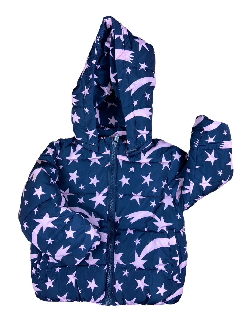 Kein nachhaltiges Label/kein Label mit Textilsiegel. Blaue Winterjacke von Stella McCartney mit Sternen-Muster.